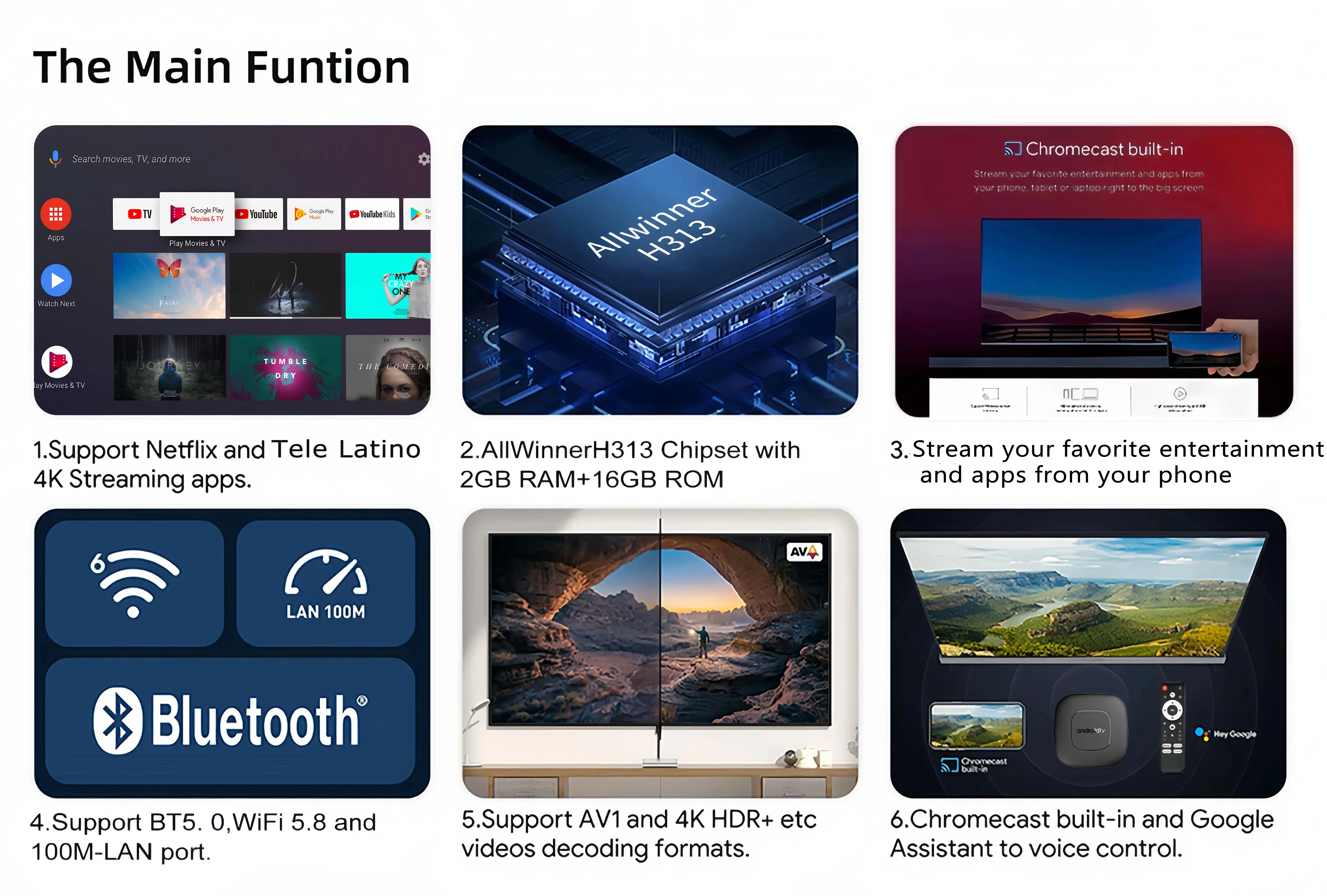 סטרימר מתקדם המבוסס על פלטפורמת AndroidTV 14, המאפשר צפייה בתכני 4K Ultra HD עם תמיכה ב-HDR. המכשיר מצויד במעבד ארבע-ליבות, זיכרון RAM של 2GB ואחסון פנימי גדול של עד 16GB, מה שמבטיח ביצועים מהירים יותר ואחסון רחב לאפליקציות. כולל חיבורי Wi-Fi 5, Ethernet, HDMI ו-USB, וכן שלט רחוק עם תמיכה בפקודות קוליות באמצעות Google Assistant