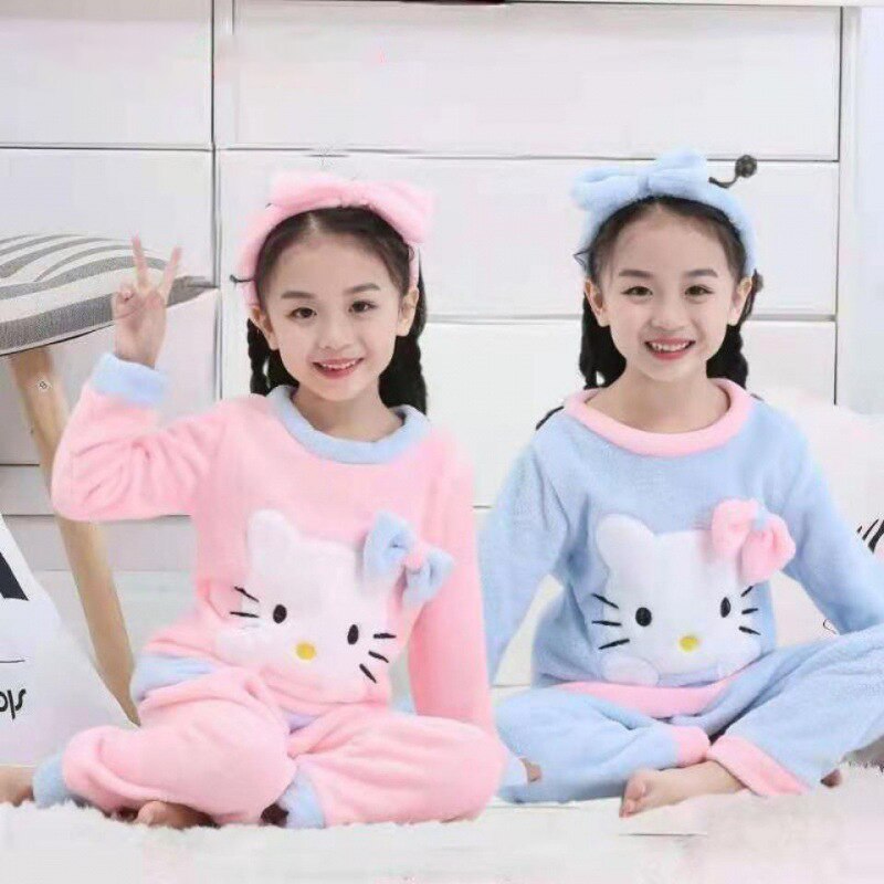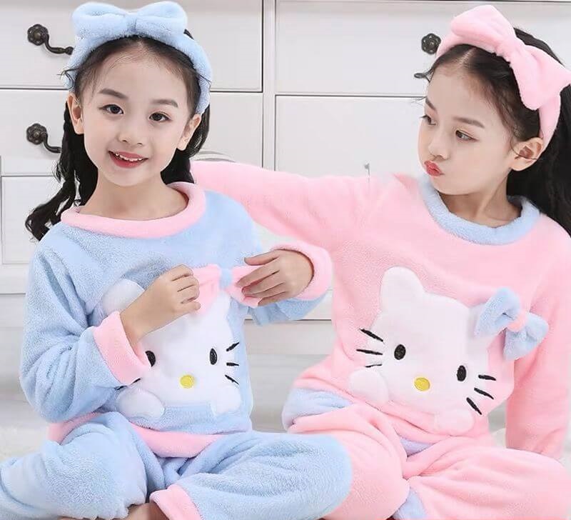 פיג’מת פליז בצבעים שונים ועיצוב של “הלו קיטי” מתאימה לילדות בגילאי 25 חודשים-12 שנים.