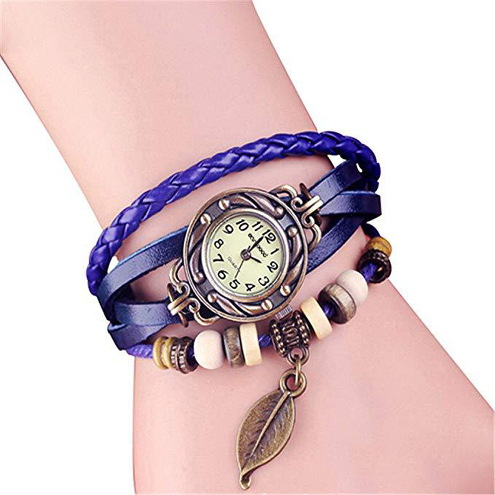 שעון יד במסגרת במראה וינטג'. שעון שהוא צמיד עם רצועת עור וצמה מקושטת בחרוזים ותליון עלה.