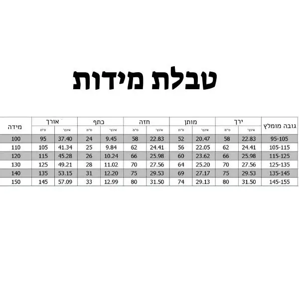 100 – גובה מומלץ 95-110 ס״מ 110 – גובה מומלץ 105-115 ס״מ 120 – גובה מומלץ 115-125 ס״מ 130 – גובה מומלץ 125-135 ס״מ 140 – גובה מומלץ 135-145 ס״מ 150 – גובה מומלץ 145-155 ס״מ